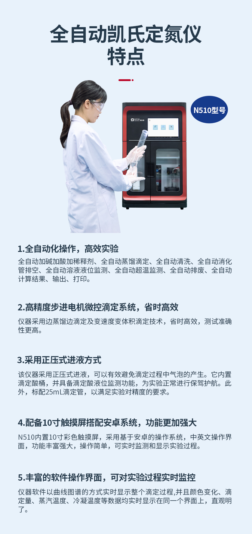 全自動加堿加酸加稀釋劑、全自動蒸餾滴定、全自動清洗、全自動消化管排空、全自動溶液液位監測、全自動超溫監測、全自動排廢、全自動計算結果、輸出、打印。